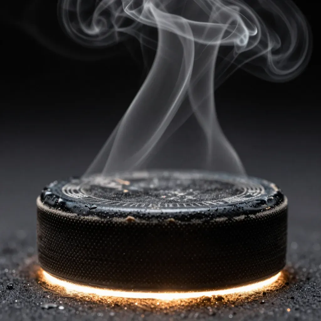 A close-up of a hockey puck with a glossy black surface and charred edges, glowing orange from its molten core, emitting white smoke against a dark, blurred background. The shallow depth of field draws attention to the puck's intricate details and glowing core.
