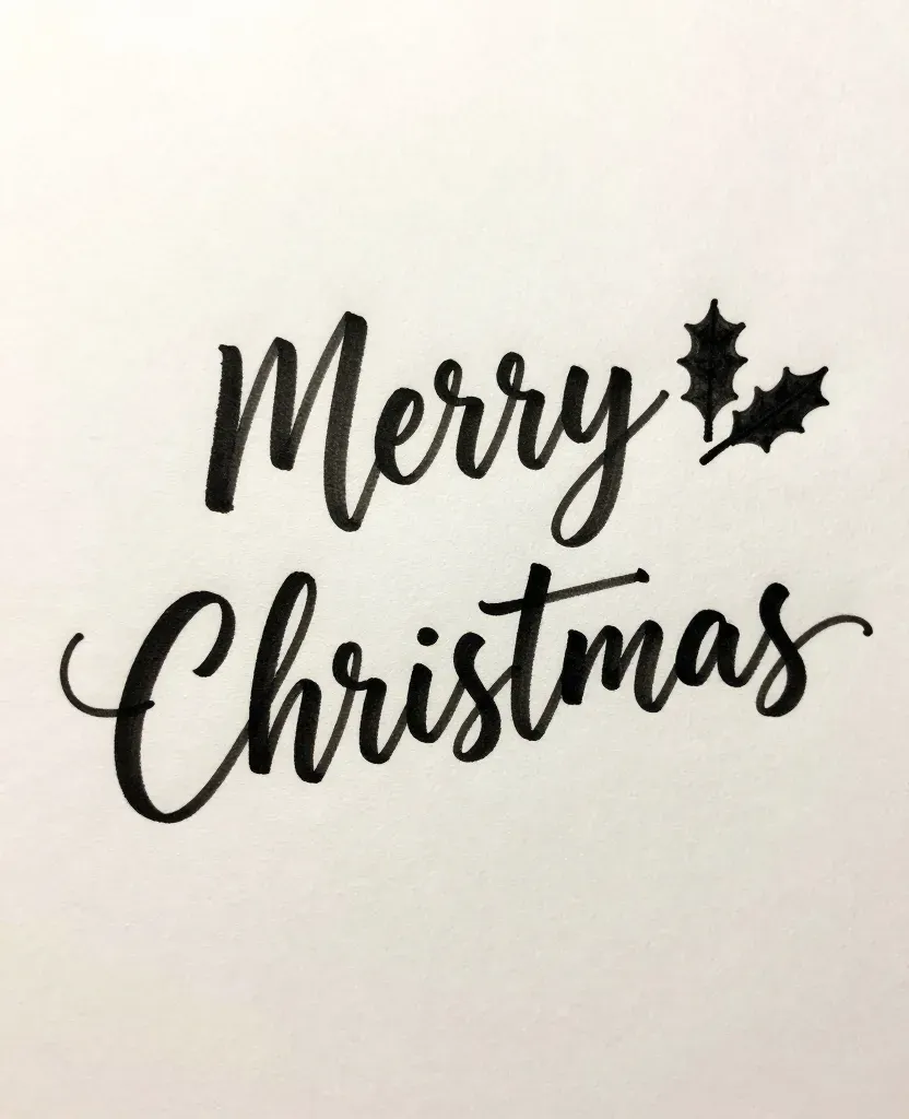 A hand-drawn 'Merry Christmas' script on white paper with a slightly rough texture, illuminated by soft, even light with gentle shadows, creating a clean and uncluttered backdrop with ample copy space.