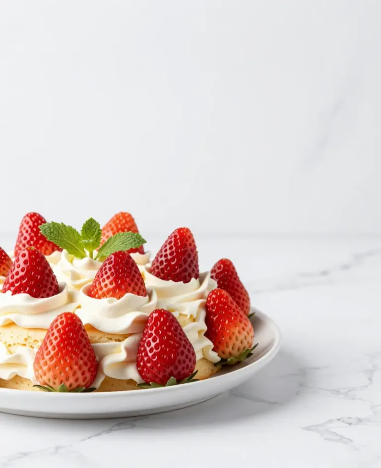 A beautifully arranged strawberry shortcake with fresh strawberries and creamy whipped cream, softly lit to highlight the glossy texture of the strawberries and the golden sponge cake beneath. The clean white marble background and slight tilt of the plate add a touch of elegance and visual interest, making it perfect for culinary and food photography.