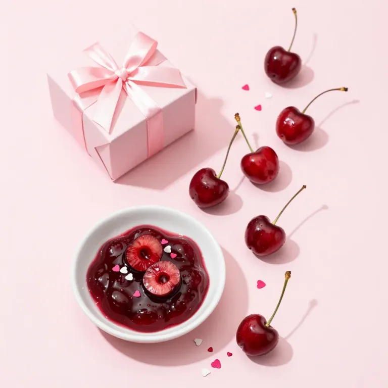 A glossy cherry compote in a smooth ceramic bowl is surrounded by fresh, taut-skinned cherries and a matte pink gift box tied with a satin ribbon, all set against a soft pink background. The soft, diffused overhead lighting creates gentle highlights and subtle shadows, with a shallow depth of field emphasizing the central bowl and diagonal arrangement for visual flow.