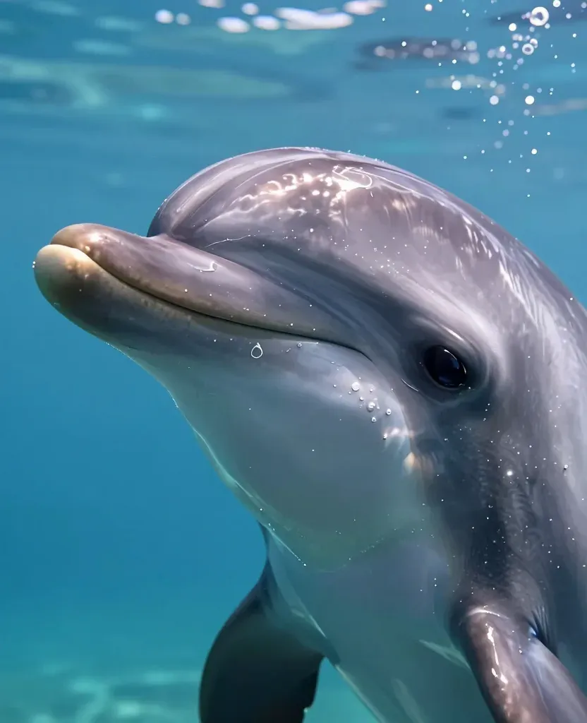 A close-up of a dolphin's snout, showcasing its smooth, glossy skin and water droplets, illuminated by natural light from above. The slightly off-center composition and blurred blue water background emphasize the dolphin's serene presence.