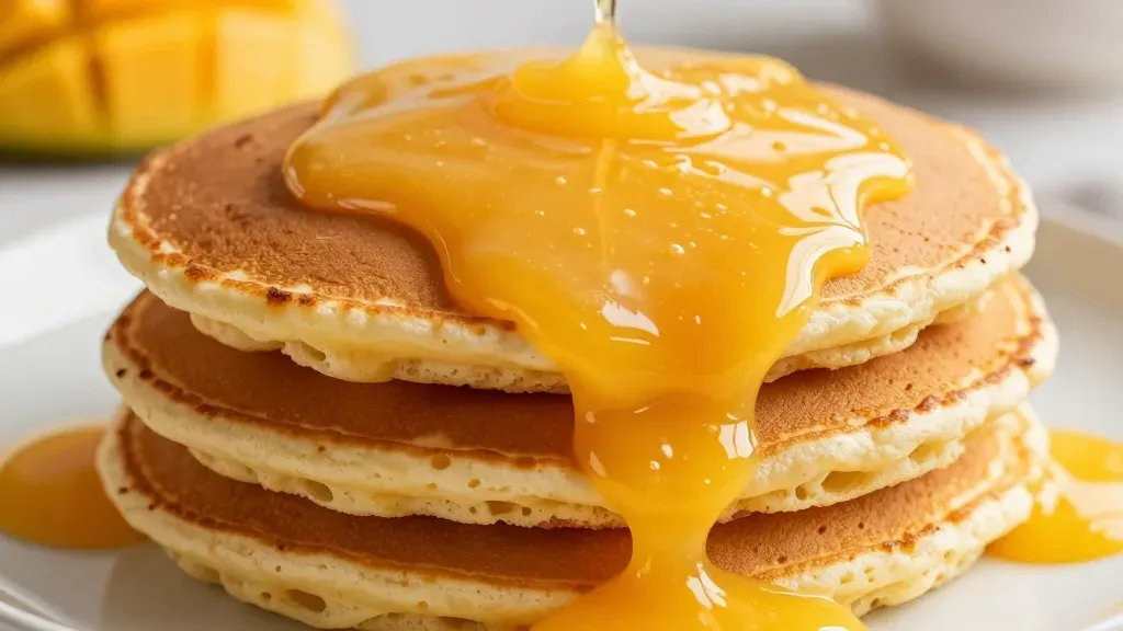 #Pancakes#Mango Puree#Syrup#Golden Brown#Glossy#Soft Light#Stacked#Food Photography#Breakfast Food#Dessert Food