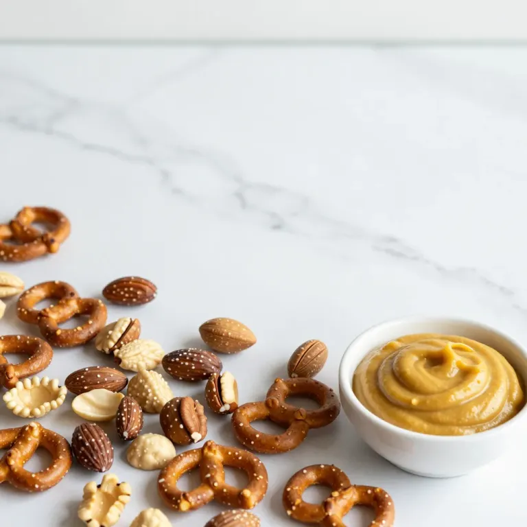 Scattered pretzels and almonds with a glossy texture, bathed in soft, diffused light that creates gentle shadows on a clean white marble countertop, emphasizing the subject and providing ample copy space.