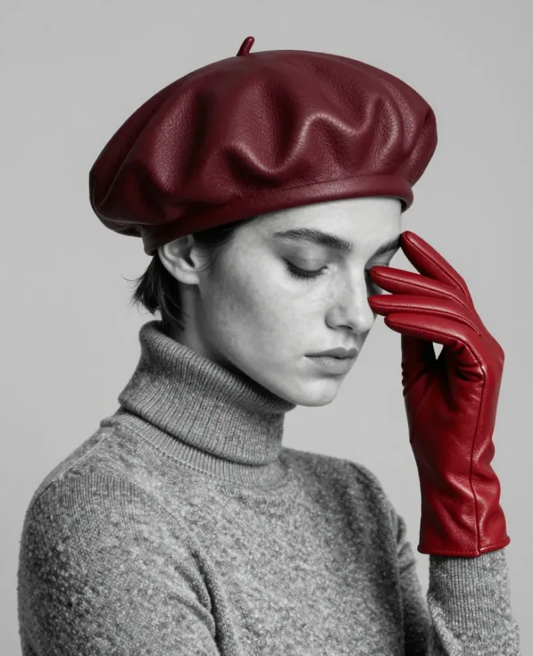 A person wearing a smooth, glossy burgundy leather beret and a soft, textured gray turtleneck sweater, with a hand in a matte red leather glove touching their forehead. Soft and diffused lighting highlights the textures of the materials, creating gentle shadows and a neutral background that draws attention to the subject.