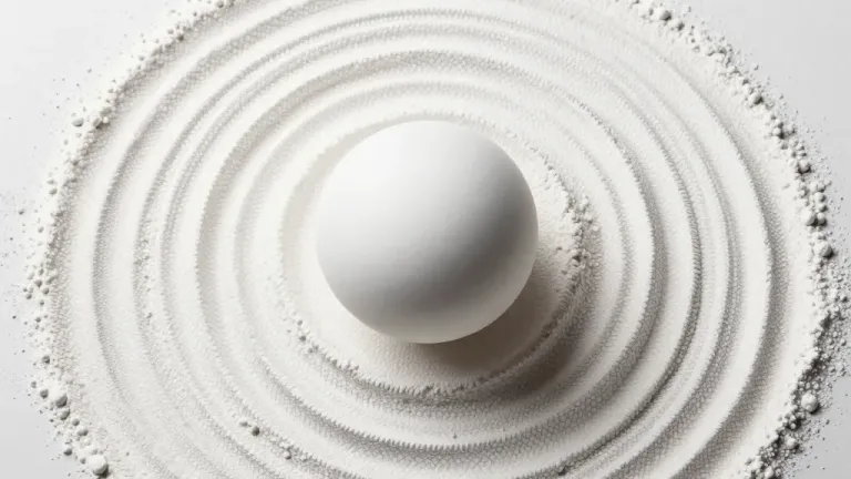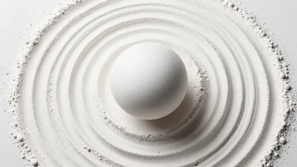 A glossy ceramic sphere sits at the center of concentric rings, creating a symmetrical pattern with soft, diffused lighting that highlights the texture and smoothness of the ceramic. The blurred background emphasizes the sphere and rings, making it ideal for product or abstract design elements.