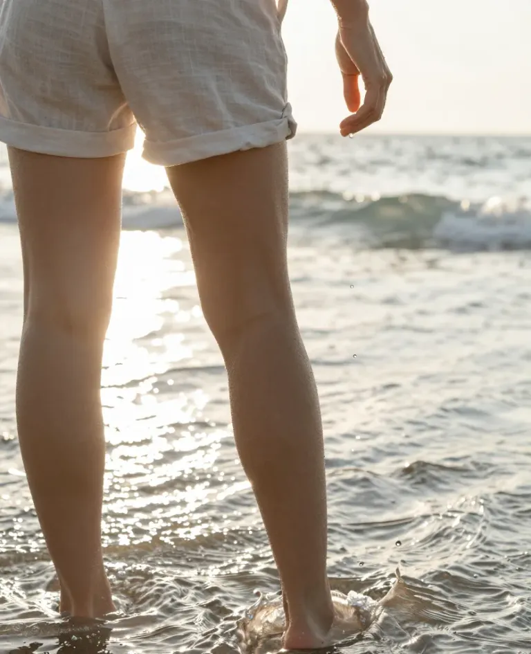 Lower legs and feet of a person in white cotton shorts walk barefoot through shallow, shimmering ocean water, skin glistening with a dewy sheen under warm, backlit sunlight. The shallow depth of field blurs distant waves, creating a soft, natural leading line toward the horizon with ample negative space for design integration.
