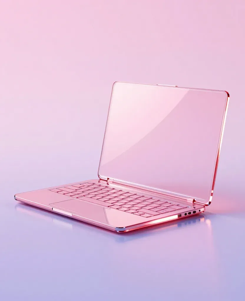 A sleek, transparent glass laptop with a pastel pink screen and keyboard, softly illuminated by diffused light, creating a modern and inviting aesthetic. The simple lavender background enhances the laptop's vibrant color and provides ample copy space for design elements.