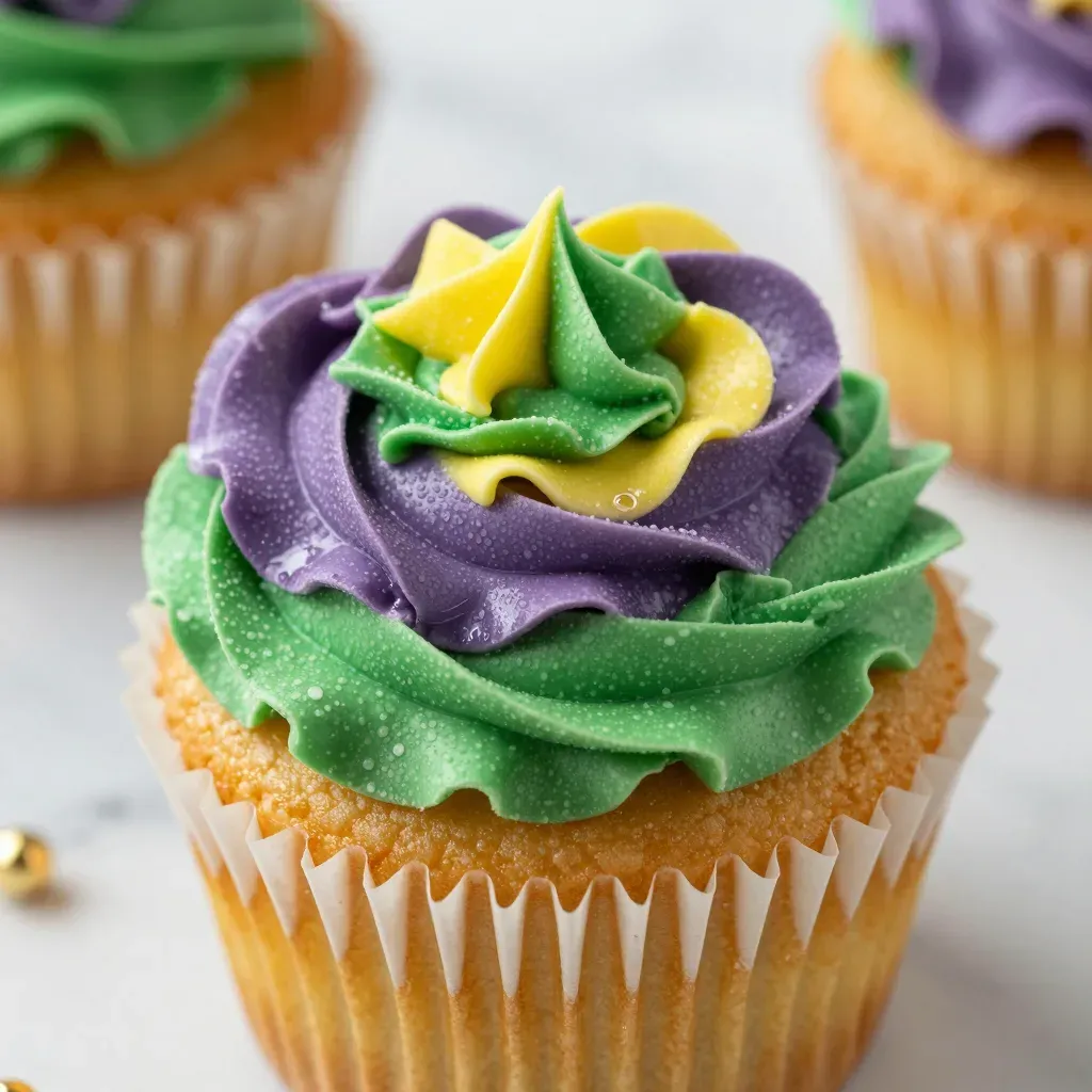 A close-up of a cupcake with smooth, glossy purple and green frosting, highlighted by soft, diffused lighting that enhances its three-dimensional effect. The shallow depth of field softly blurs the background, focusing attention on the vibrant, textured frosting.