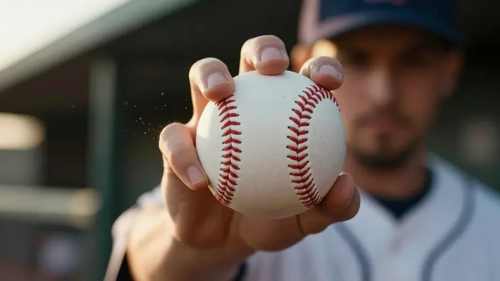 A close-up of a baseball held by a player's hands, showcasing the rough leather texture and red stitching under golden sunlight. The shallow depth of field blurs the background, emphasizing the ball and the player's focused expression.