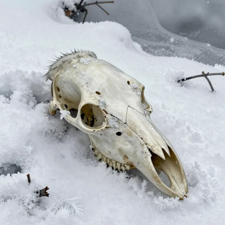 A wolf skull, partially covered in frost, lies in a snowy landscape, illuminated by diffused, soft light that highlights its rough, weathered texture and icy details. The close-up view and slightly tilted composition provide a detailed examination of the skull's structure and the surrounding frosty environment.
