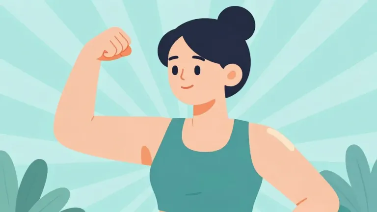 A woman with dark hair in a bun flexes her right bicep while wearing a teal tank top, her smooth skin and soft fabric rendered in a clean vector style. The radial backlighting creates a glowing aura around her, framed by a symmetrical sunburst pattern and blurred foliage, suggesting a nature-inspired setting with ample copy space.