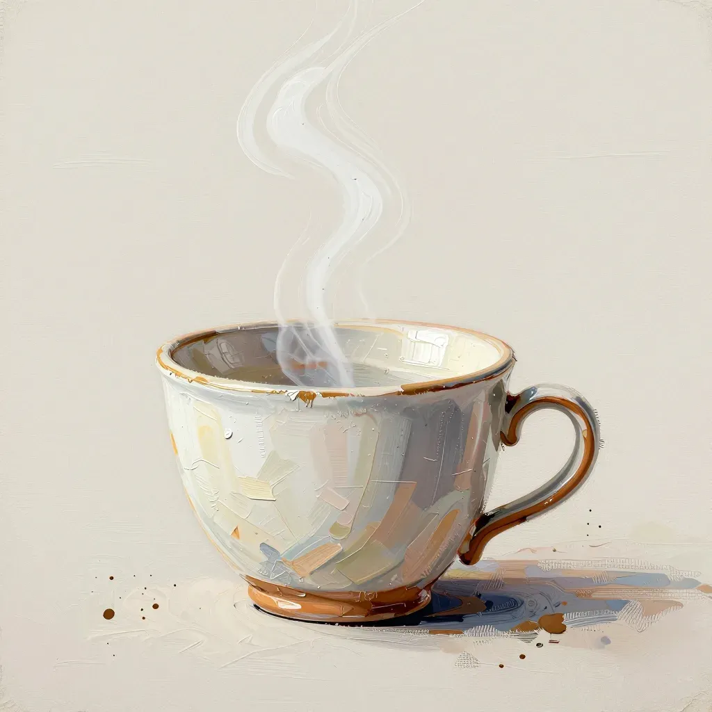 A glossy, layered paint cup of coffee emits steam, capturing a soft, diffused light that highlights the cup's texture and creates gentle shadows. The pure white background emphasizes the cup as the focal point, offering ample copy space for design elements.