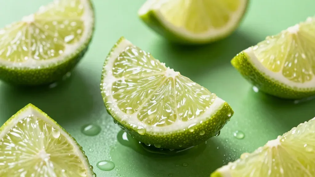 Crisp lime wedges scattered on a wet surface, highlighting their translucent flesh and glossy texture. The soft, diffused lighting enhances the moisture and vibrant green color, creating a clean and uncluttered backdrop.