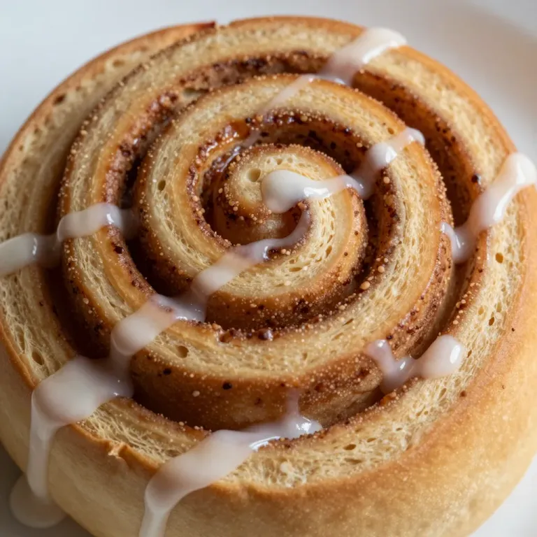 A close-up of a glossy, caramelized cinnamon roll with creamy icing, softly lit to highlight the swirls and texture. The shallow depth of field keeps the focus on the roll against a blurred white background.