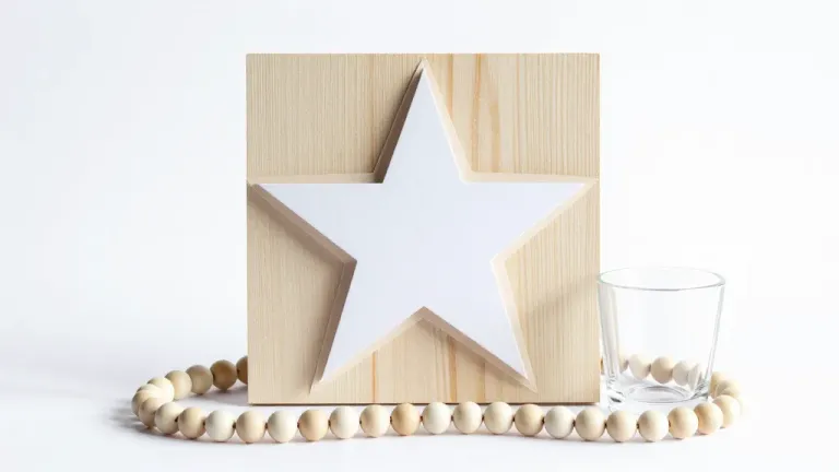 A star-shaped wooden sculpture with a glossy finish, arranged with beads in a circular pattern, set against a clean white backdrop. Soft, diffused lighting highlights the texture and creates gentle shadows, emphasizing the clean composition and minimal distractions.