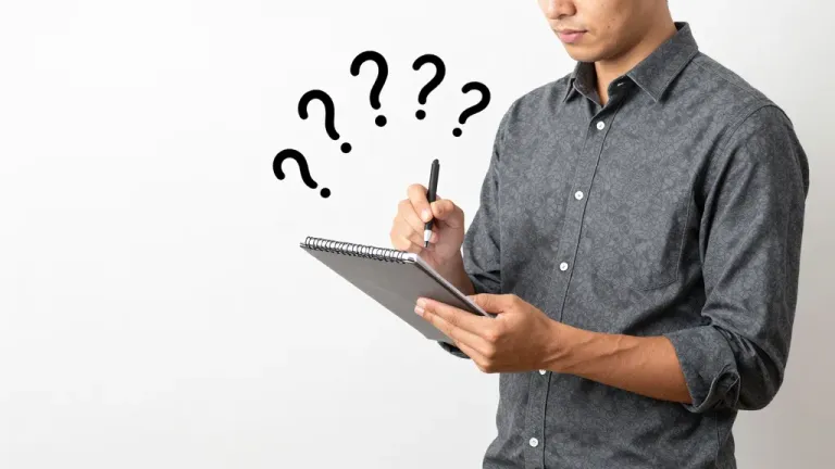 A man in a patterned shirt holds a glossy notebook and a smooth folder, with question marks above his head, suggesting contemplation or confusion. The bright, even lighting and shallow depth of field create a focused, intimate portrait with ample copy space.