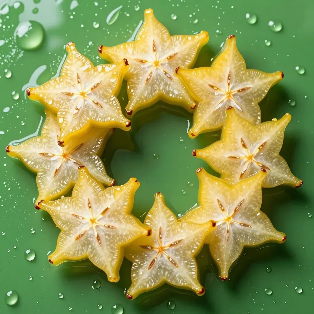 Cross-sectioned carambola slices form a circular pattern, their translucent yellow flesh glistening with water droplets and crisp edges. Soft diffused lighting enhances the luminous texture, while a shallow depth of field isolates the subject against a smooth green backdrop with scattered droplets.
