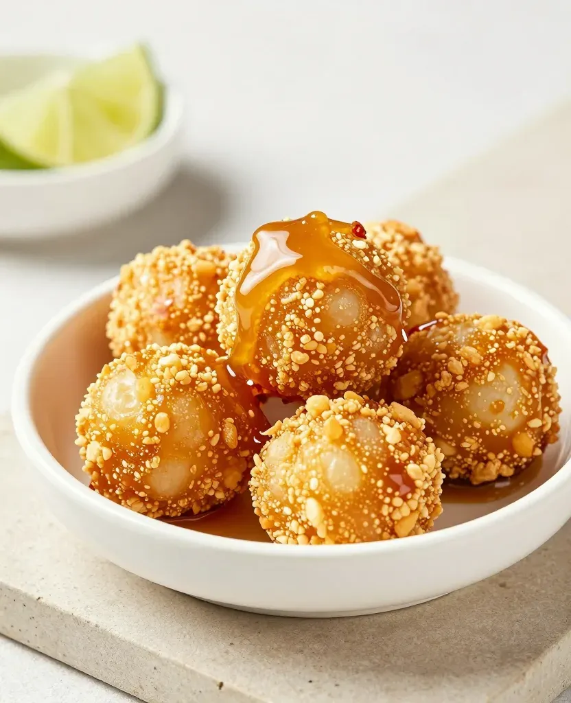 Fried or steamed glutinous rice balls, coated in crushed peanuts and sesame seeds, are drizzled with glossy caramel sauce, revealing soft translucent centers. Soft diffused lighting from the upper left highlights the textures, while a shallow depth of field focuses attention on the central ball against a minimalist background.