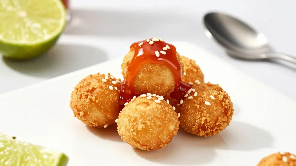 A cluster of golden-brown fried balls, one crowned with glossy amber sauce and scattered sesame seeds, rests on a white plate with lime wedges and a spoon softly blurred in the background. Soft directional lighting from the upper left creates subtle highlights on the sauce and seeds, while shallow depth of field isolates the subject against a clean white surface.