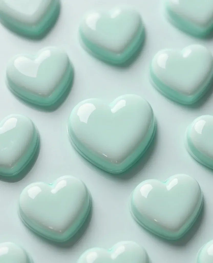 Heart-shaped candy plaques with a smooth, glossy, translucent mint glaze are arranged in a repeating grid, reflecting soft overhead light. The shallow depth of field and uniform off-white background emphasize the pastel vibrancy and clean, rhythmic composition.