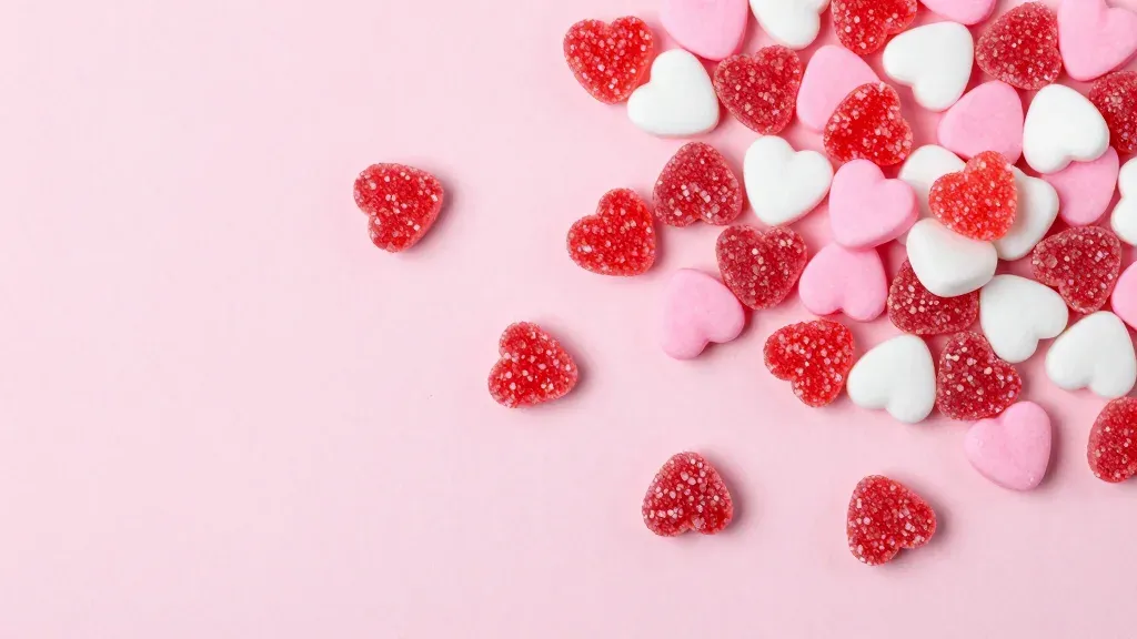 Heart-shaped candies in red, pink, and white are scattered diagonally across a soft pink surface, exhibiting a glossy sugary coating with some fine crystalline texture. The soft diffused overhead lighting creates gentle highlights and minimal shadows, with a shallow depth of field focusing on mid-ground candies and ample copy space on the left.