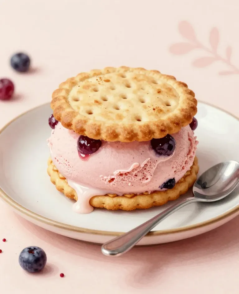 A delectable berry ice cream sandwich with glossy blueberries and golden-brown cookies, softly lit and artfully composed on a white plate with a spoon, set against a delicate pink background with a blurred branch pattern.