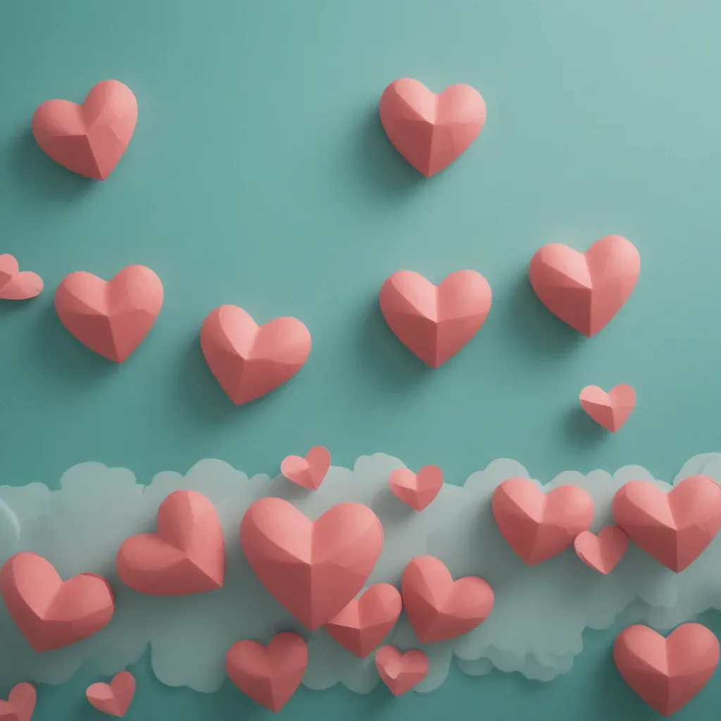 Coral-pink geometric hearts with a matte, paper-like texture are scattered across a teal background, creating a soft, diffused light effect with gentle shadows. The composition offers a clean and minimalistic aesthetic, ideal for design elements or promotional materials.