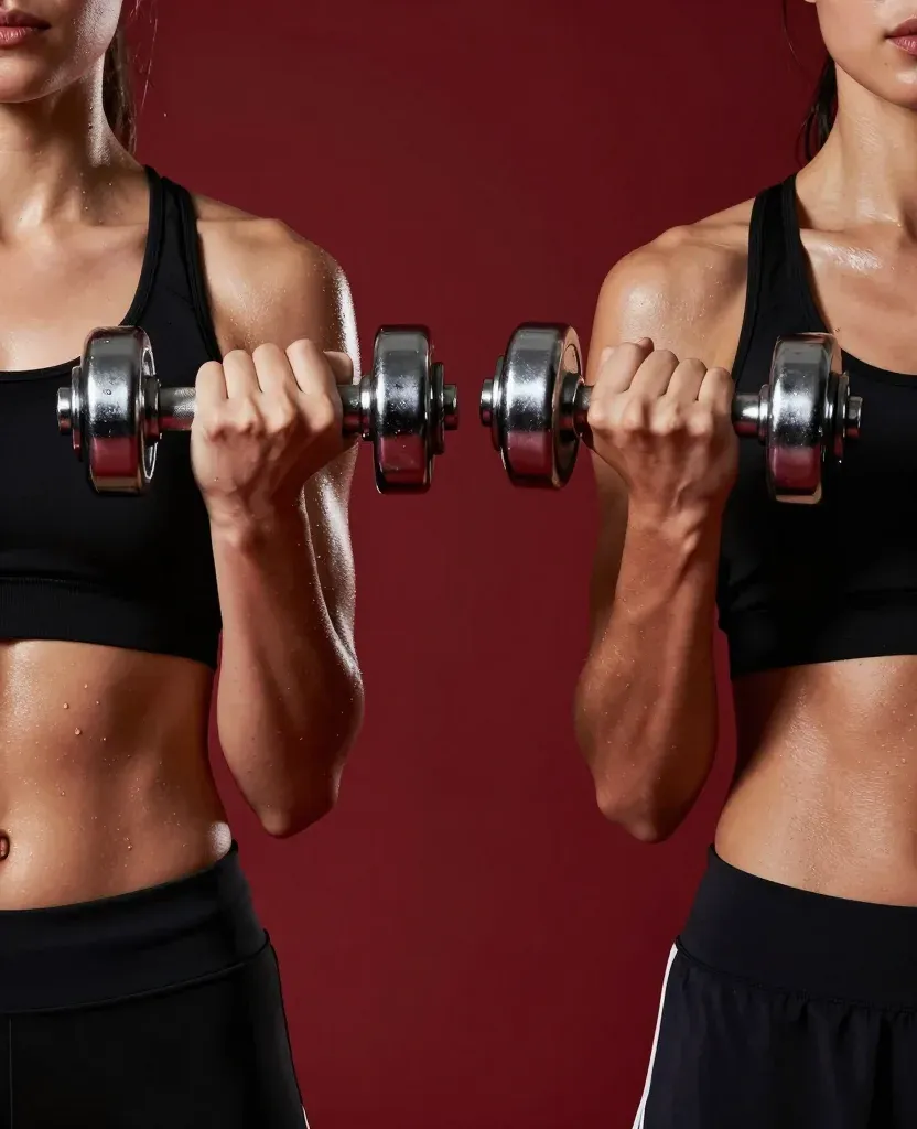 A woman in a black sports bra and leggings performs a dumbbell curl, showcasing her toned arms and defined muscles. The dramatic lighting highlights the contours and shadows, emphasizing the strength and definition of her upper body against a deep red background.