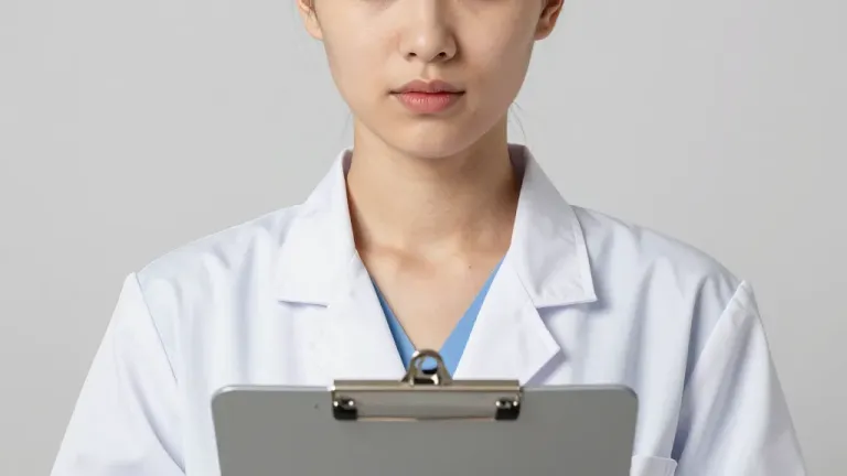 A young individual in a white lab coat holds a clipboard with a metallic clip, illuminated by soft, diffused light from above, creating gentle shadows. The clean, light gray background ensures a distraction-free setting, ideal for professional or educational content.