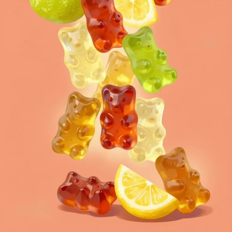 Translucent gummy bears in vibrant colors cascade downward, illuminated by soft, diffused lighting that creates gentle shadows and highlights their glossy texture. The warm peach background, blurred to emphasize the gummy bears, adds depth and a playful atmosphere.
