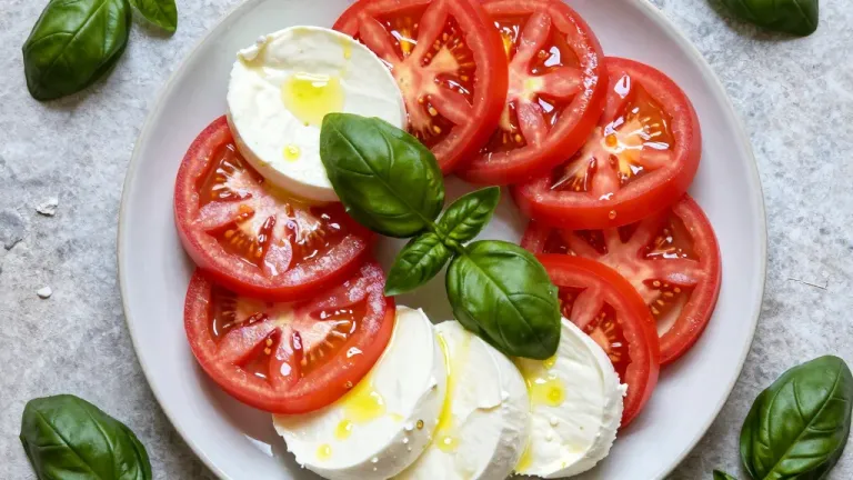 Juicy tomato slices, creamy mozzarella, and crisp basil leaves are arranged in alternating rings on a white ceramic plate, drizzled with a light sheen of olive oil. Soft, diffused natural light from the upper left creates gentle highlights and subtle shadows, while a shallow depth of field keeps the plate in sharp focus against a blurred grey stone background.