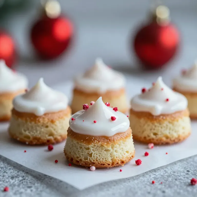 Circular arrangement of mini cakes with glossy white peppermint glaze and red sprinkles, softly lit to highlight texture and create gentle shadows. Blurred red ornaments in the background add a festive holiday context.