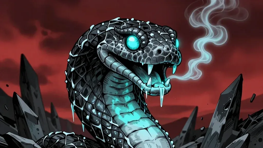 A large, serpentine idol with glossy metallic scales and glowing turquoise eyes stands amidst a desolate, frost-covered landscape, casting a cold, spectral glow. The dim, eerie lighting enhances the texture of the scales and spires, creating a sense of depth and scale.