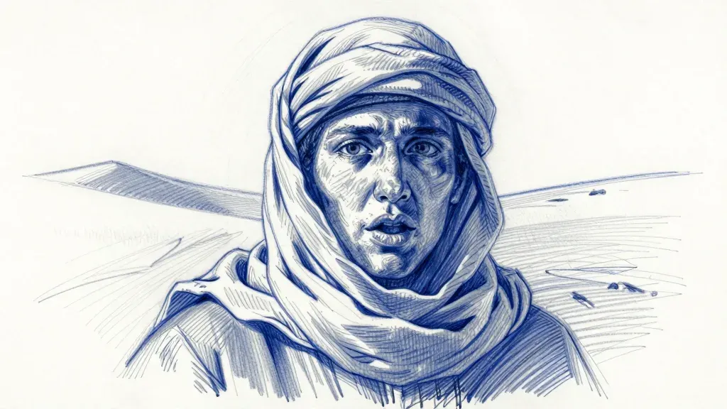 A close-up of a desert nomad wearing a textured turban, with directional lighting casting deep shadows and highlighting the face and scarf. The blurred background suggests a desert landscape, creating a shallow depth of field.