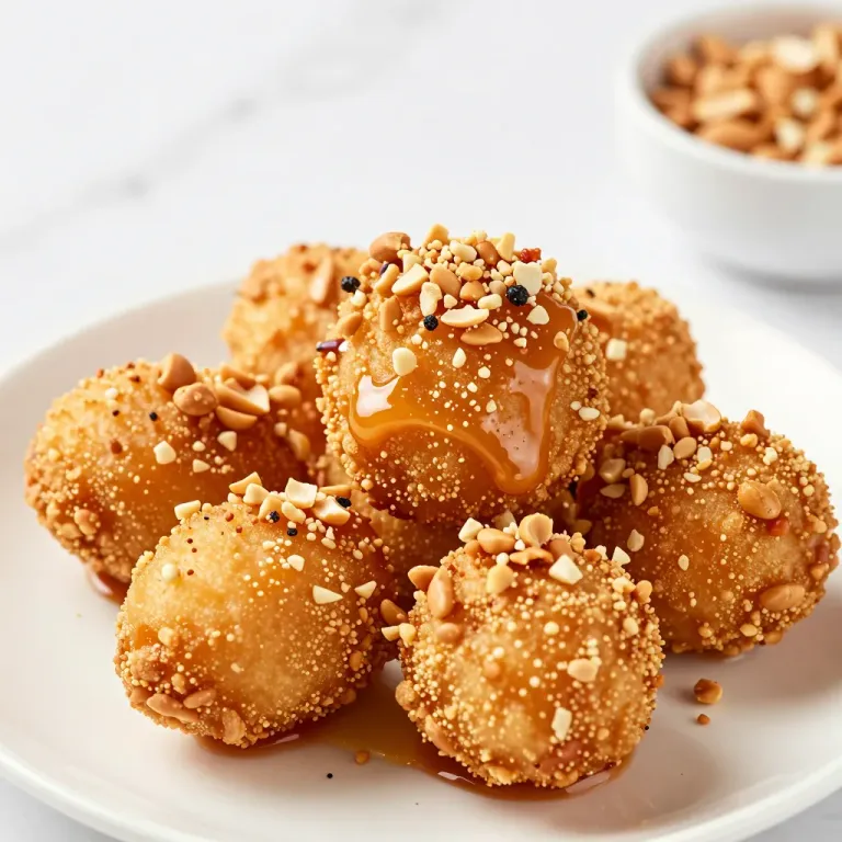 Golden-brown fried dessert balls are generously coated in coarse crushed peanuts and drizzled with glossy caramel sauce, revealing a soft interior through a slight indentation. Soft, high-key lighting from the upper left creates subtle highlights on the caramel and peanuts, with a shallow depth of field isolating the central cluster against a clean white marble background.