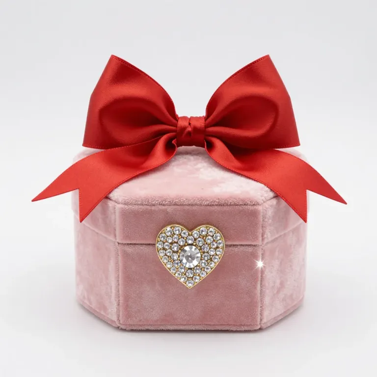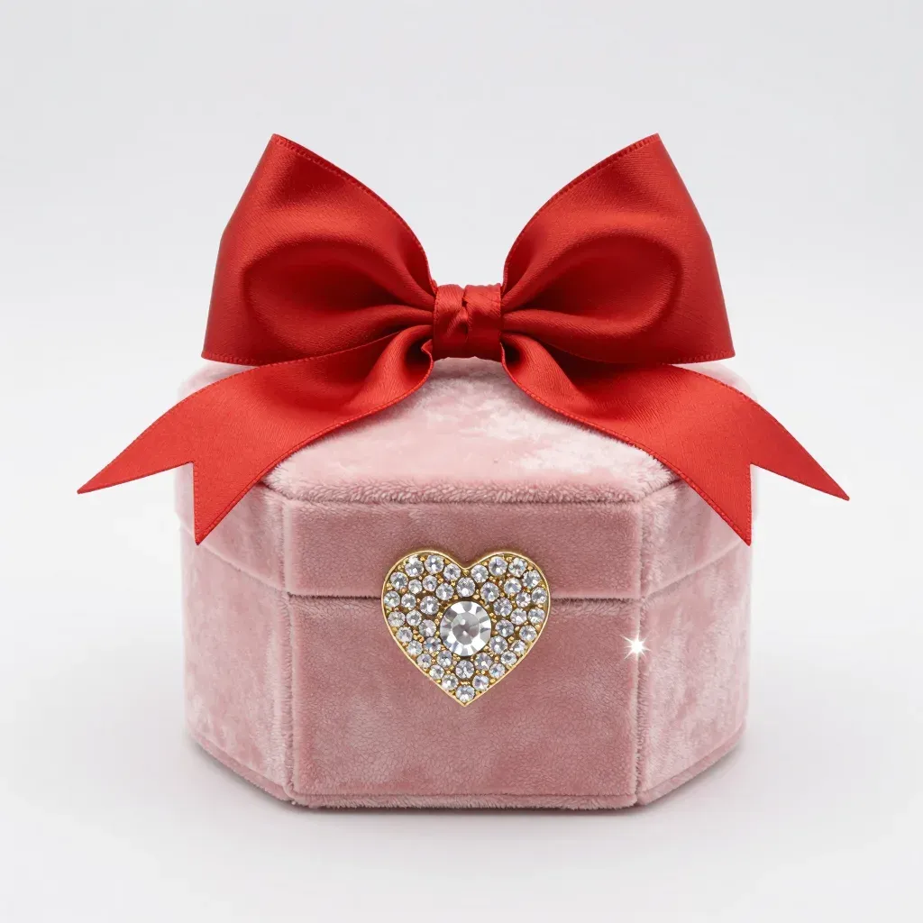 A soft pink velvet jewelry box adorned with a glossy red satin bow and a sparkling heart-shaped brooch, set against a clean white background that highlights the elegant details and warm lighting. The balanced composition and diffused light create a luxurious and inviting atmosphere, perfect for product showcases or gift presentations.