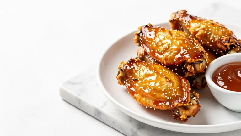 Crispy glazed chicken wings topped with sesame seeds are arranged on a white ceramic plate, accompanied by a small ramekin of dipping sauce. Soft diffused lighting from the upper left creates glossy highlights on the glaze, while a shallow depth of field and clean white marble background emphasize the subject with ample copy space.
