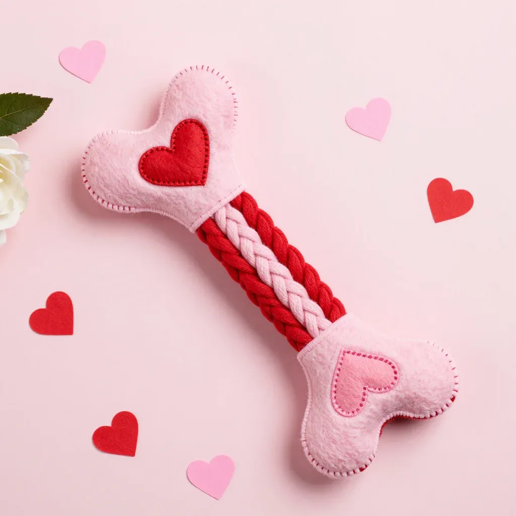 A soft pink felt dog toy shaped like a bone features a braided red cord center and heart appliqués, with visible stitching enhancing its handmade appeal. Soft diffused lighting creates gentle highlights and subtle shadows, while a shallow depth of field isolates the subject against a pale pink background with scattered hearts and a white rose in the corner.