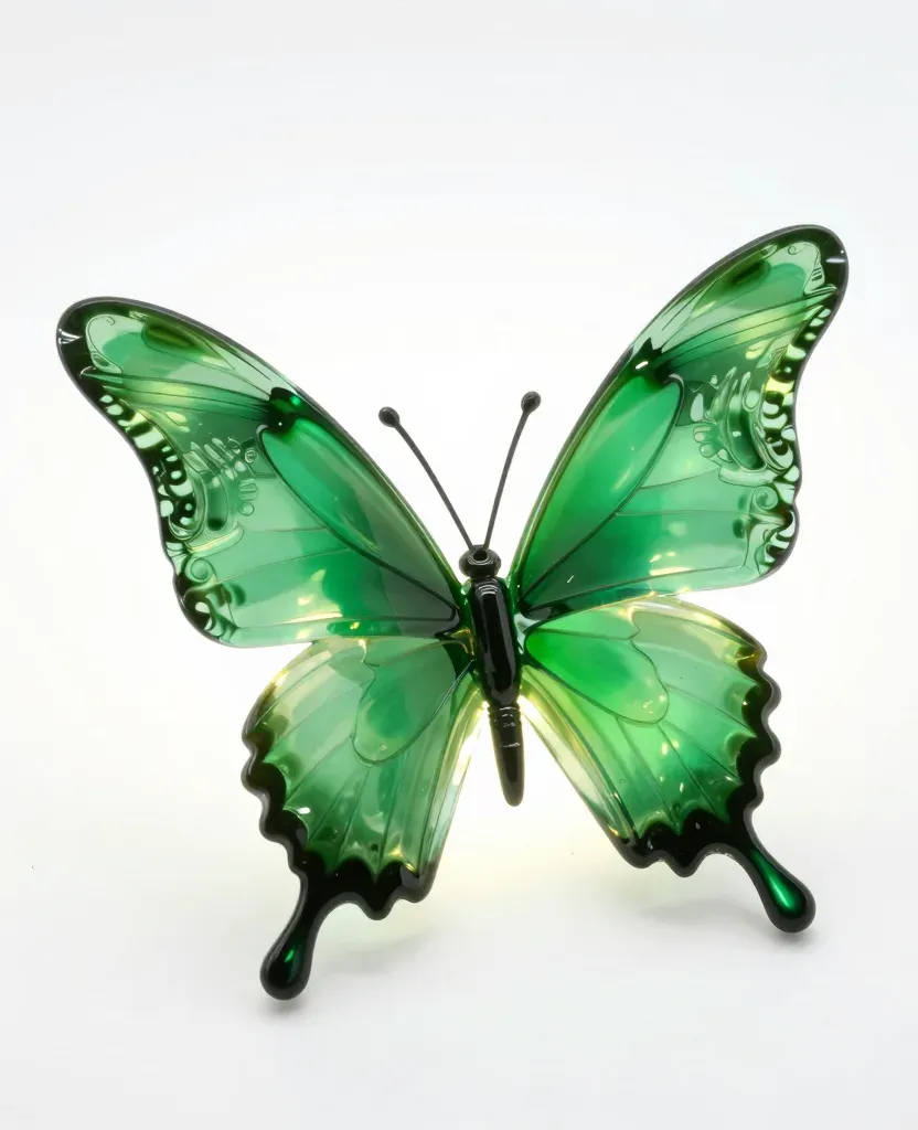 A translucent emerald-green glass butterfly with glossy wings, softly lit by diffused light, creating highlights and shadows. The pure white background emphasizes the delicate wings and provides ample copy space.