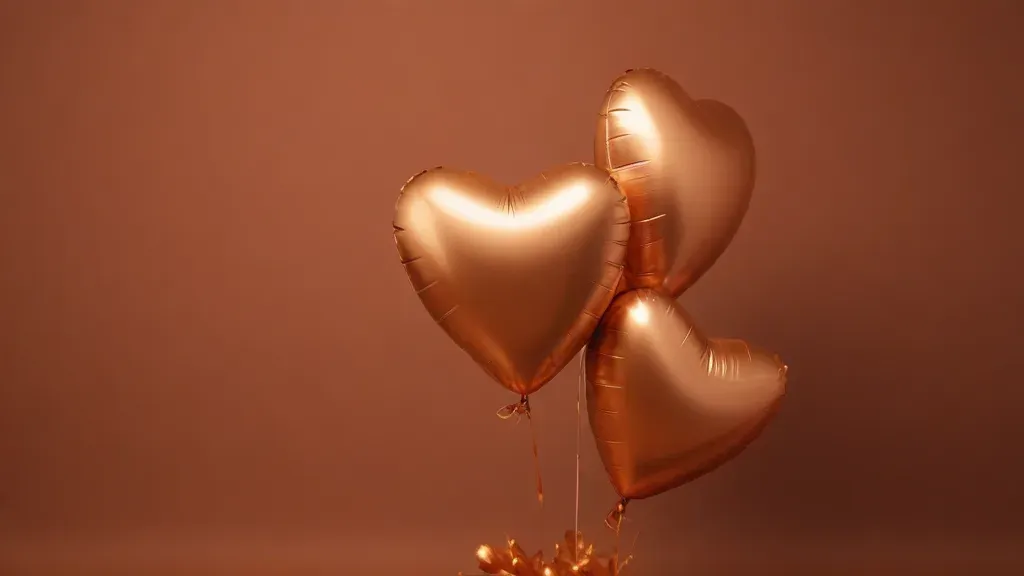 A cluster of golden heart-shaped balloons gleams under soft, diffused golden light, creating a warm, autumnal atmosphere. The shallow depth of field blurs the background, emphasizing the balloons and adding a sense of depth to the composition.