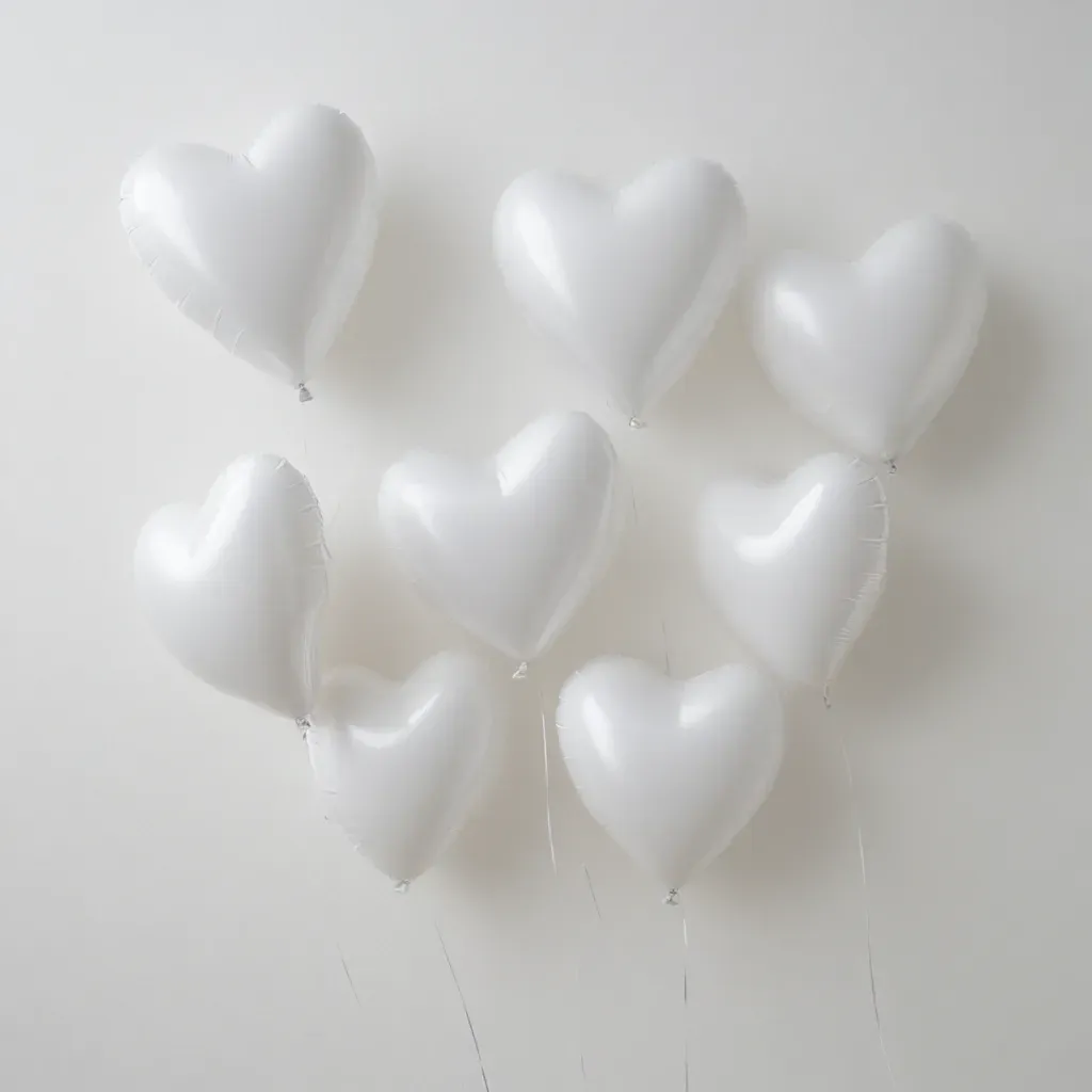 A cluster of white heart-shaped balloons, glossy and reflective, softly illuminated by diffused light from above, creating gentle highlights and shadows. The minimalistic, pure white background enhances the unity and simplicity of the composition, making it ideal for wedding or romantic themes.