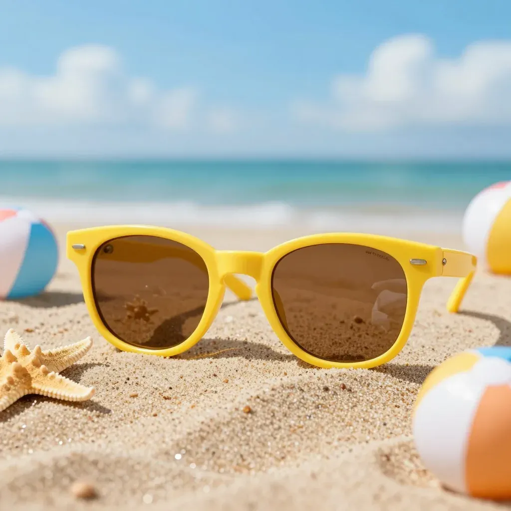 A pair of yellow sunglasses with brown lenses rests on the sand, surrounded by a starfish and a colorful beach ball, under bright sunlight that creates sharp shadows and highlights. The shallow depth of field blurs the background, focusing attention on the sunglasses and the starfish, offering a clean and minimalistic composition.