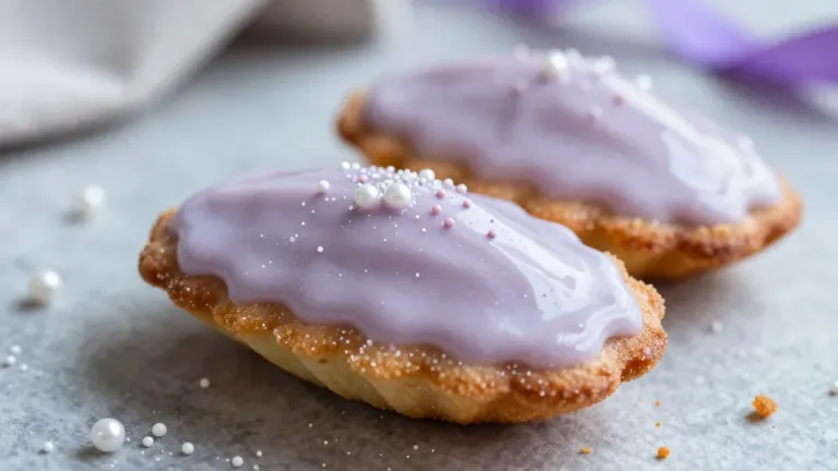 Crisp, airy madeleines with glossy lavender icing and white sugar pearls are highlighted by soft, diffused light, creating a warm, inviting glow. The close-up, centered framing with a shallow depth of field focuses on the madeleines against a clean, light gray background with scattered sugar pearls.