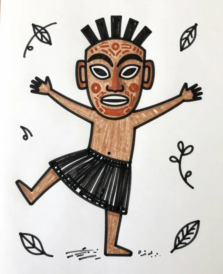 A dancer with outstretched arms and face paint, wearing a glossy black skirt, stands against a simple background with scattered leaves and musical notes, slightly blurred to emphasize the subject. The bright and even lighting highlights the subject's vibrant earthy tones and glossy textures.