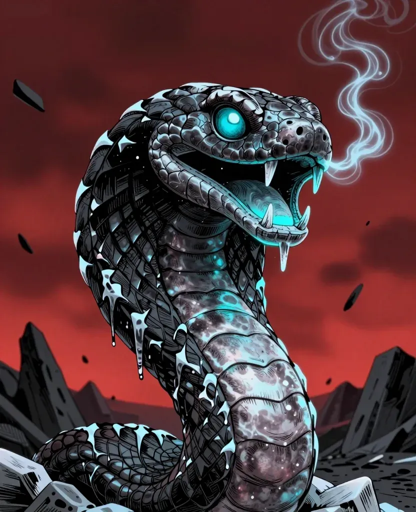 A large, serpentine creature with icy blue scales and sharp teeth roars in a fiery red sky, surrounded by jagged debris. The harsh, directional light highlights the glossy, icy scales and sharp teeth, creating reflections and shadows, while the background's blurred, chaotic debris adds depth and a sense of chaos.