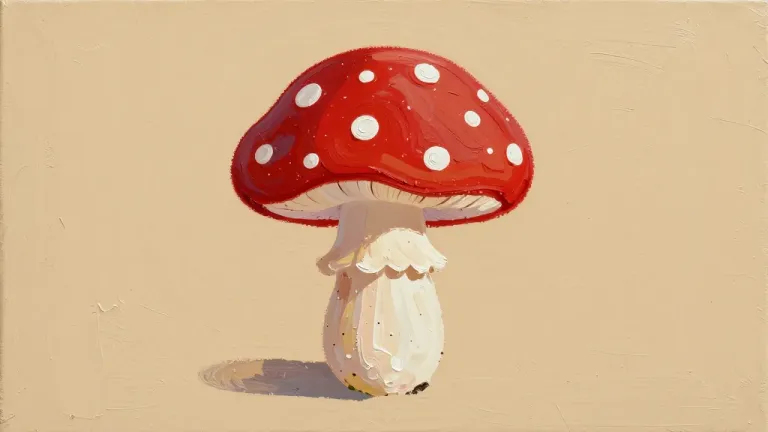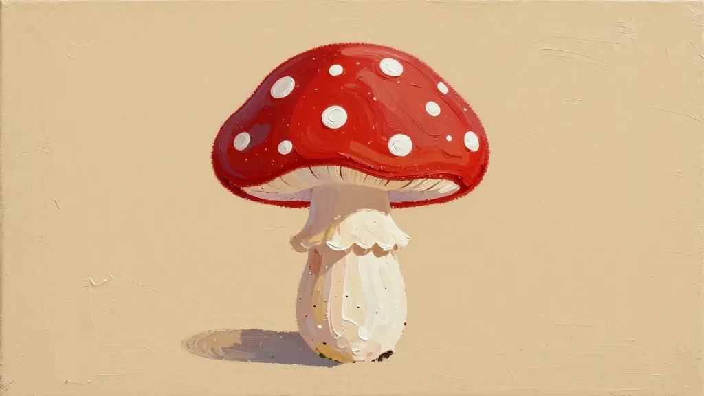 A large, glossy red mushroom with white spots stands out against a light beige background, illuminated by a soft light from the left, casting a subtle shadow on the right. The composition is centered, creating a dynamic and engaging visual with ample copy space.
