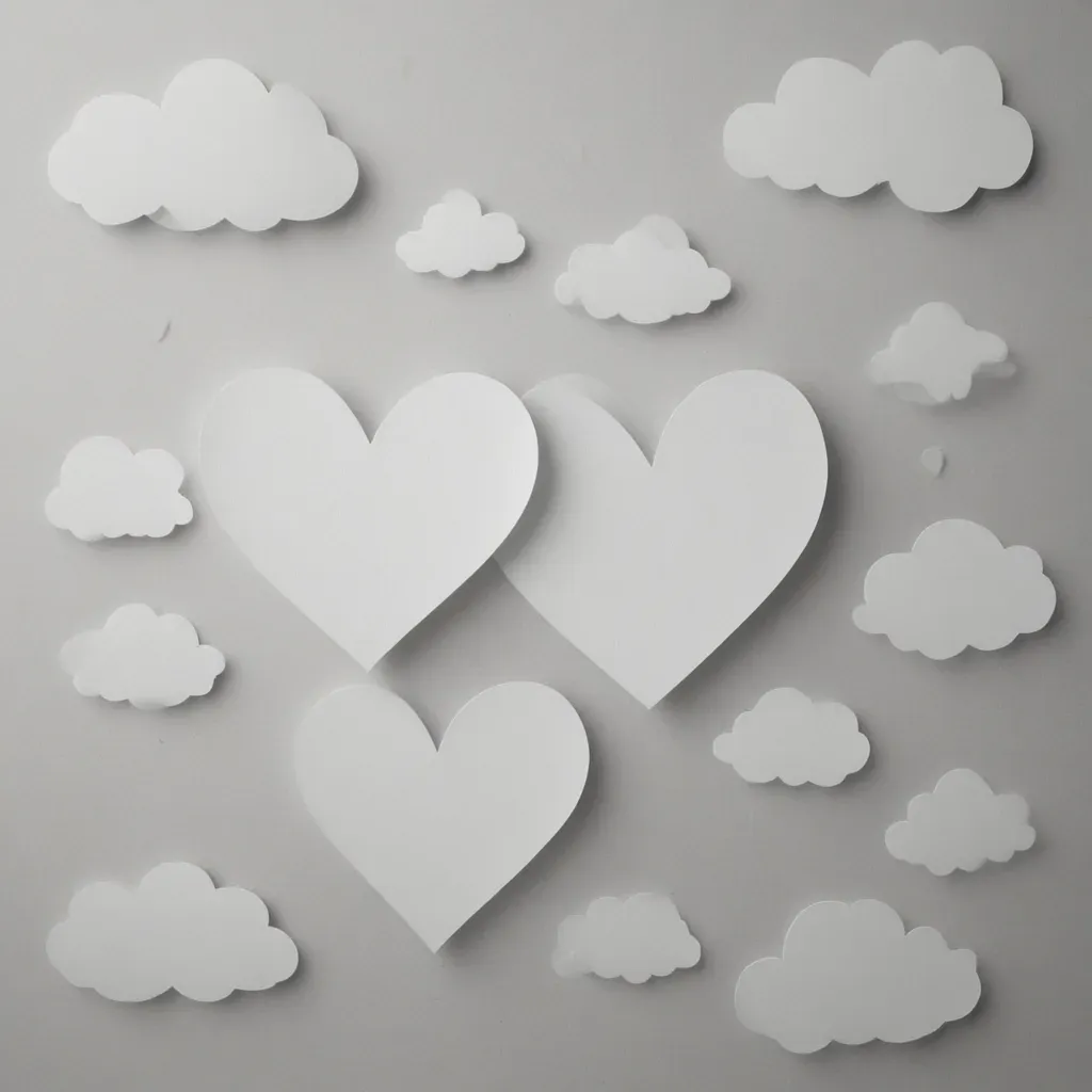 Two glossy white hearts and smaller white clouds are arranged against a soft, diffused light backdrop, creating a serene and harmonious composition. The uniform gray background enhances the subjects, offering ample copy space for various design applications.
