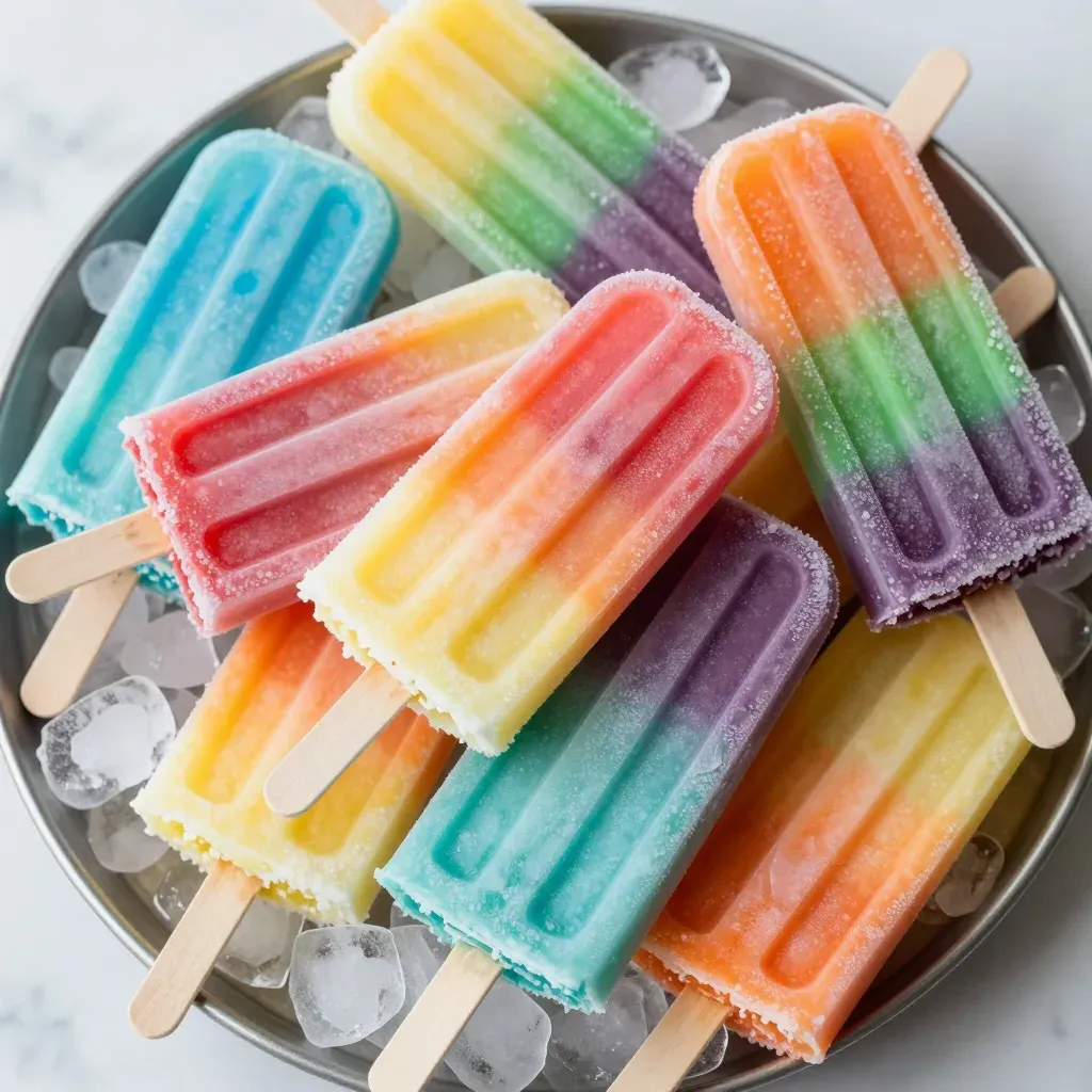 A vibrant flat lay of rainbow popsicles with wooden sticks, showcasing a glossy, icy texture under soft, diffused lighting that highlights their smooth surfaces and creates reflections. The popsicles are arranged slightly overlapping on a metallic tray with ice cubes, emphasizing their refreshing and colorful appeal.