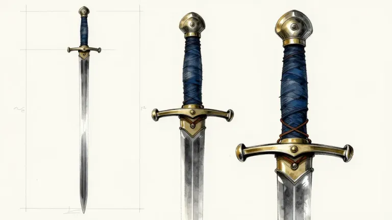 A detailed close-up of a blue leather-strapped longsword, highlighting its metallic blade and gold accents under directional lighting that creates a glossy sheen and deep shadows. The minimal white background emphasizes the sword, providing ample copy space for design integration.