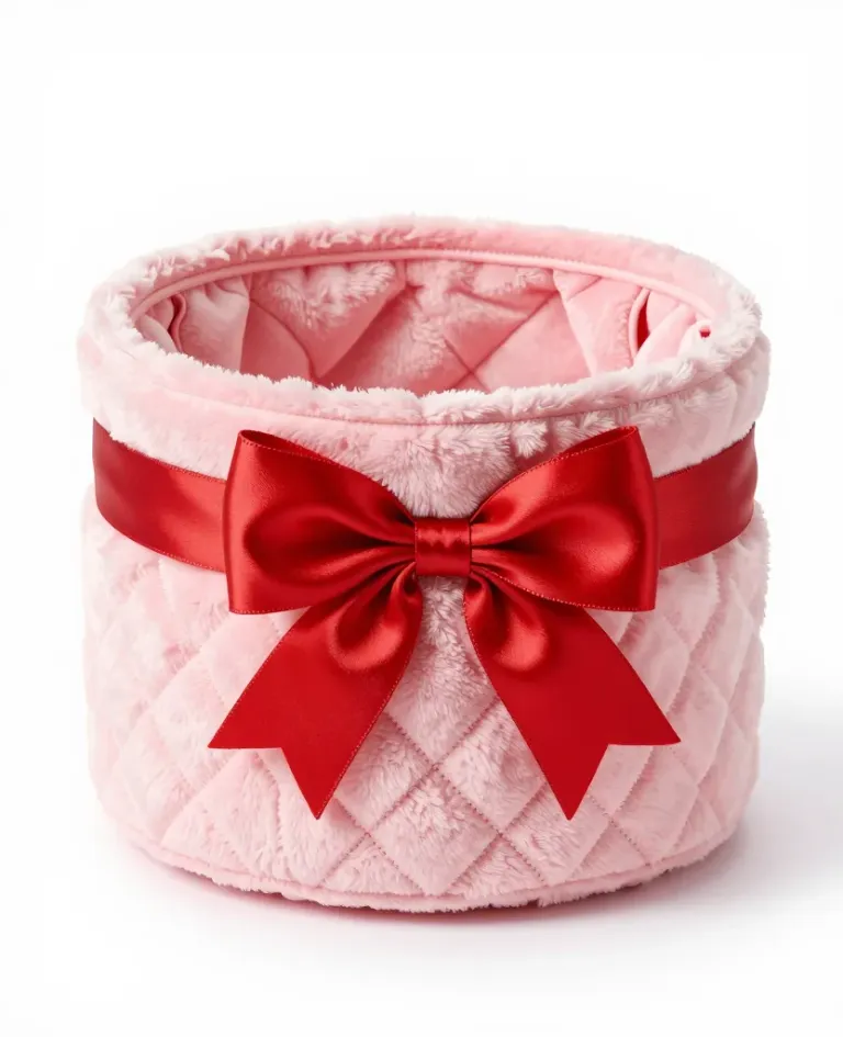 A soft, fuzzy pink basket adorned with a glossy red satin bow, set against a plain white background. The diffused lighting highlights the textures and creates a sense of intimacy, making it ideal for product photography and interior design inspiration.